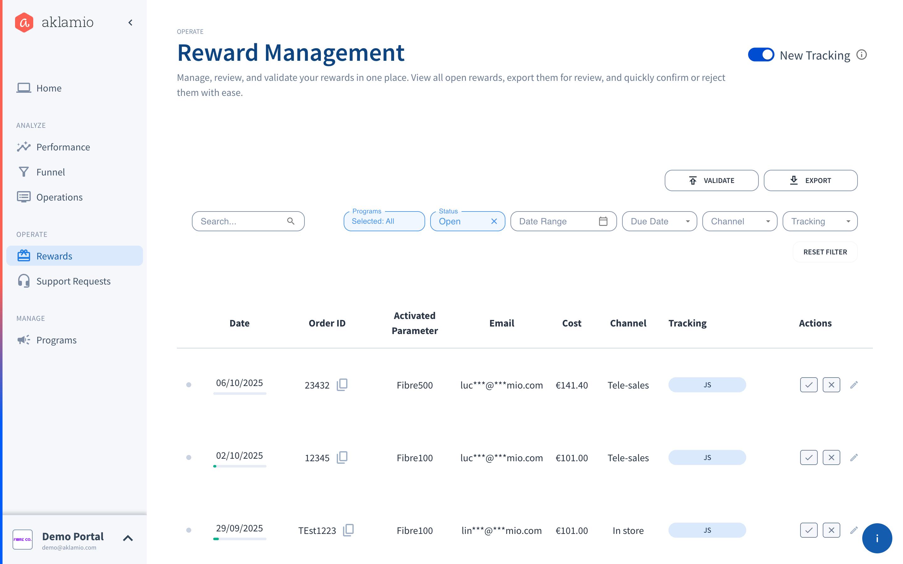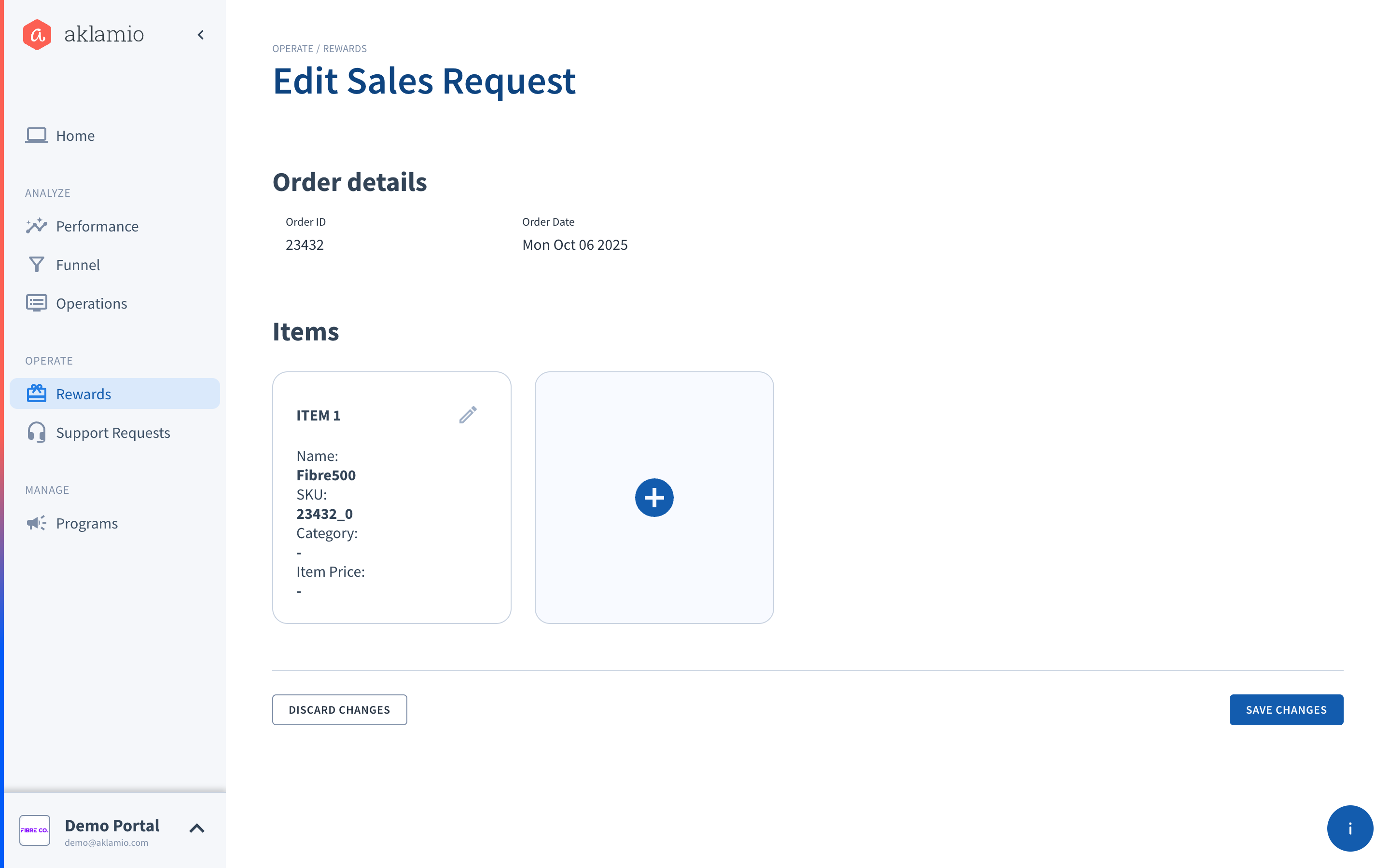 The Edit Rewards feature allows you to adjust the details of a tracked sales event (the "sales request") before validation. This is essential when the original tracked data needs correction—for instance, if a customer changed their order or if an item's price was updated post-tracking. By editing the items, you ensure the reward engine checks the conversion against the most accurate sales data, preventing incorrect rewards from being granted or rejected.