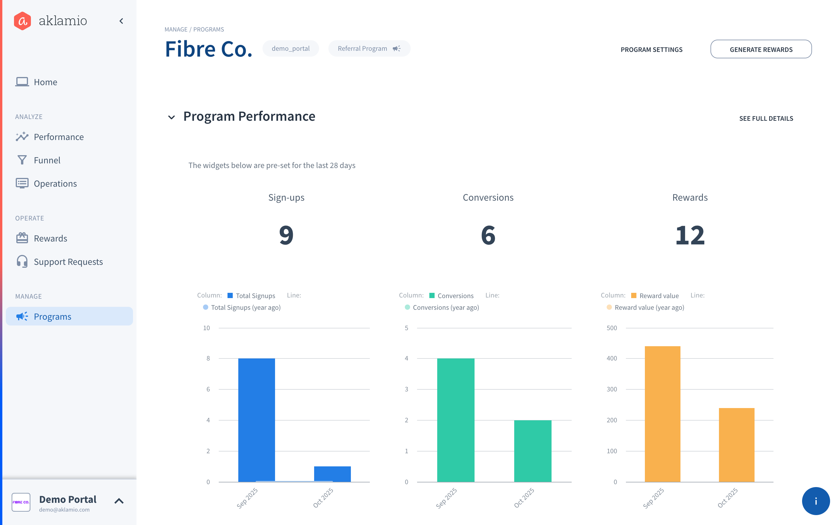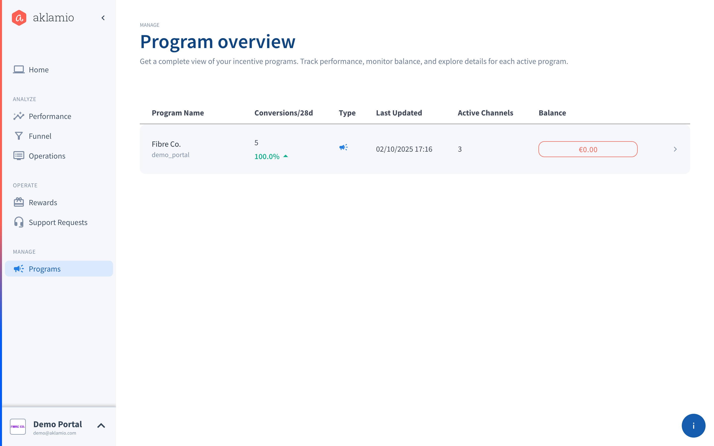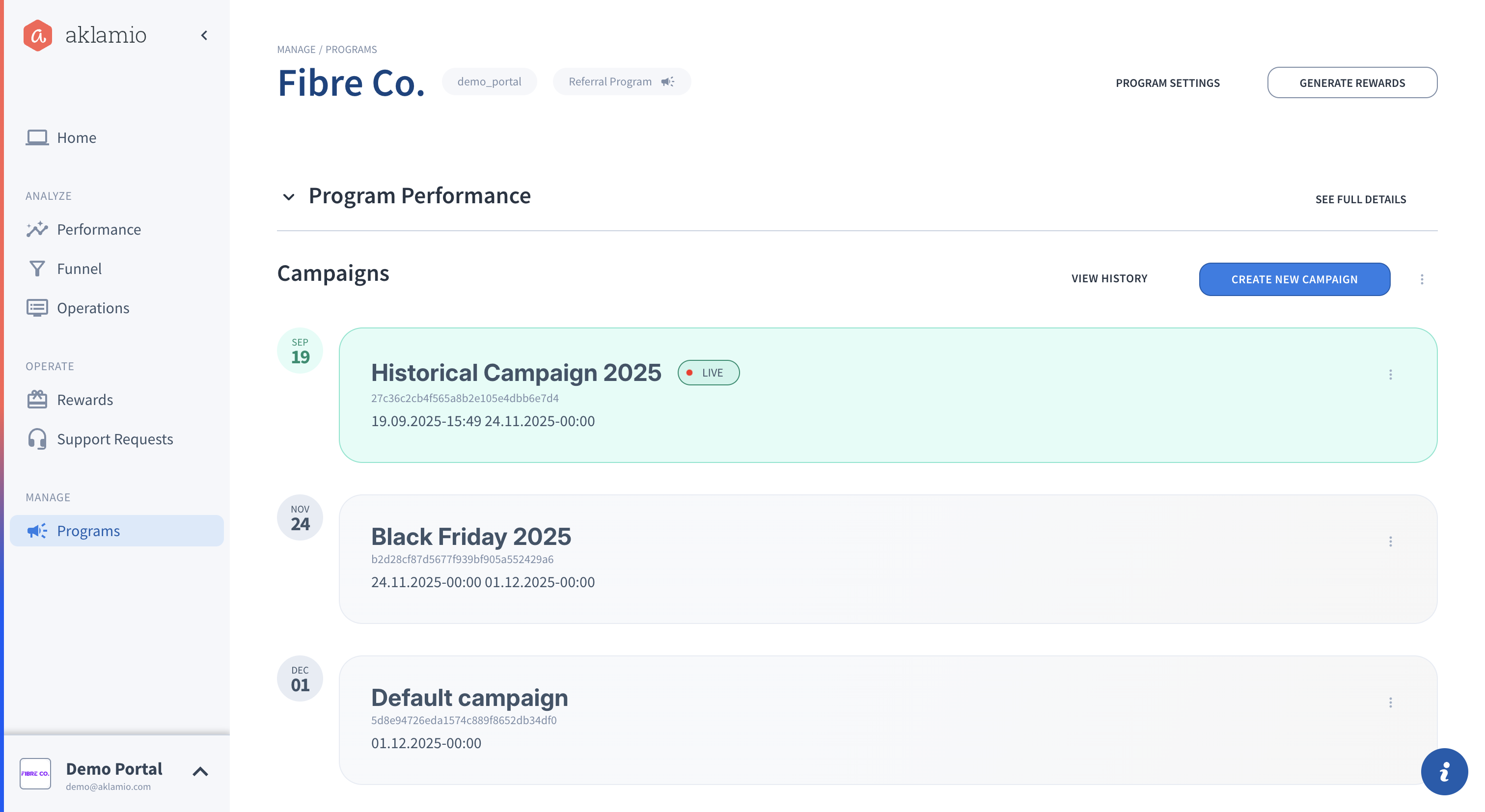 The Aklamio Programs section provides a centralized hub to track the health, performance, and configurations of all the referral, cashback, or other incentive programs running for your brand. This allows you to quickly assess recent performance and dive deeper into specific program settings and rule plans.