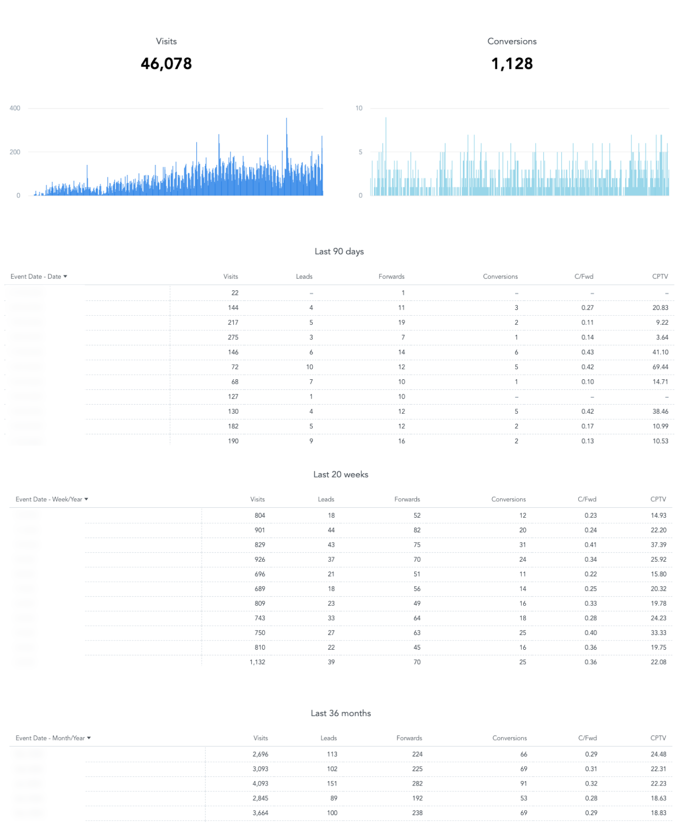 - User Journey Metrics: Visits, Leads (clicks), Forwards, and Conversions.