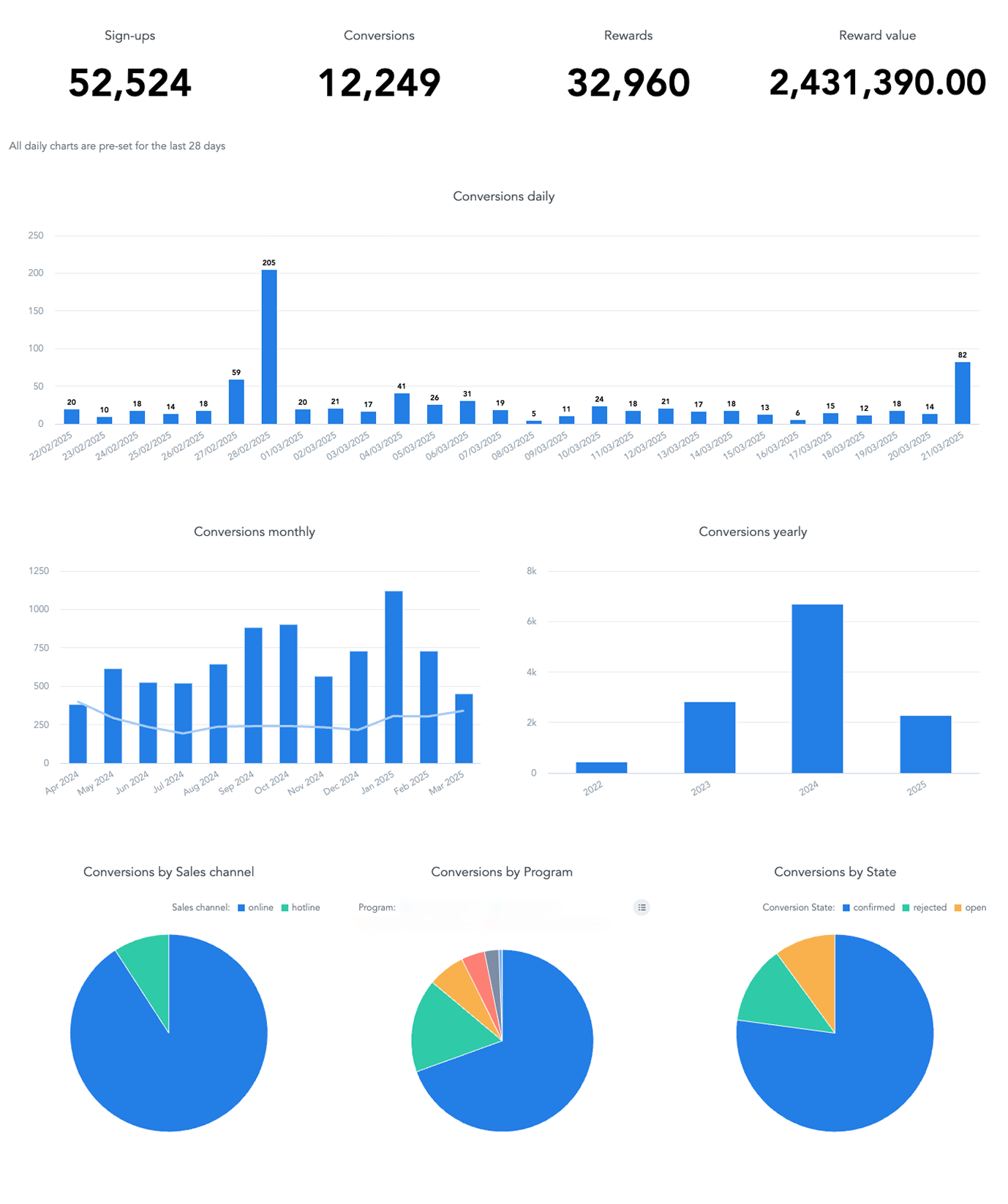 Below the main metrics, you can find detailed breakdowns of Conversions by time (daily, monthly, yearly), Sales Channel, Program, and conversion State (confirmed, rejected, open).