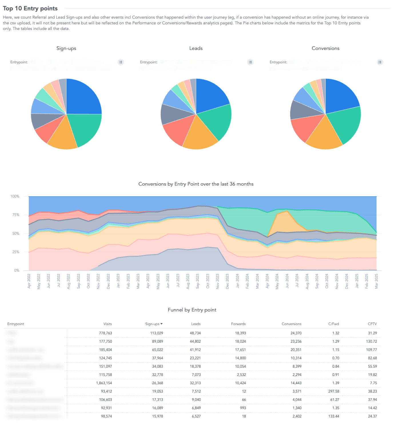 - User Journey Metrics: Visits, Referrer Sign-ups, Shares, Leads (clicks), Forwards, and Conversions.