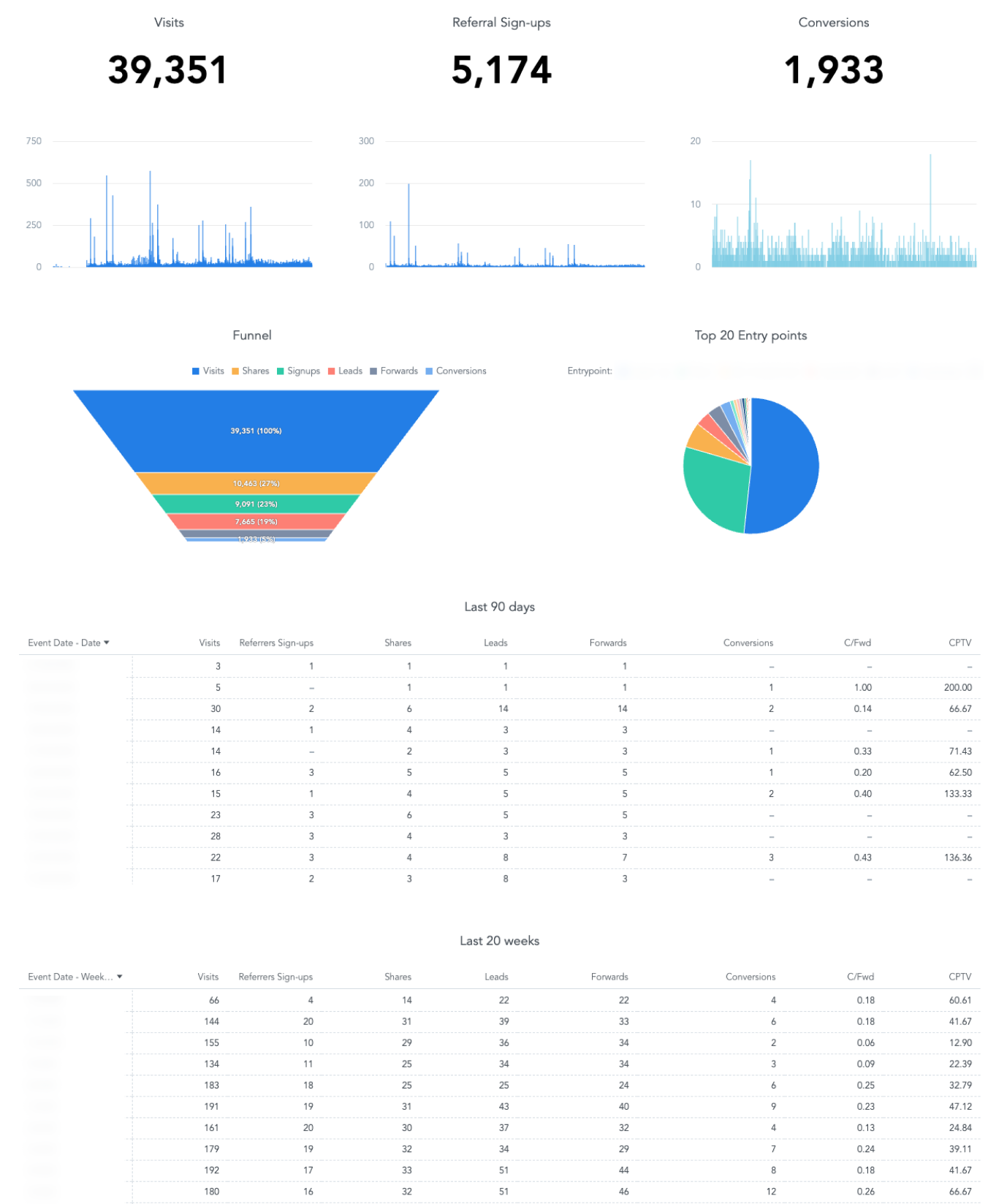 For your referral programs, this view details key metrics across the user journey, available for the last 90 days, 20 weeks, and 36 months: